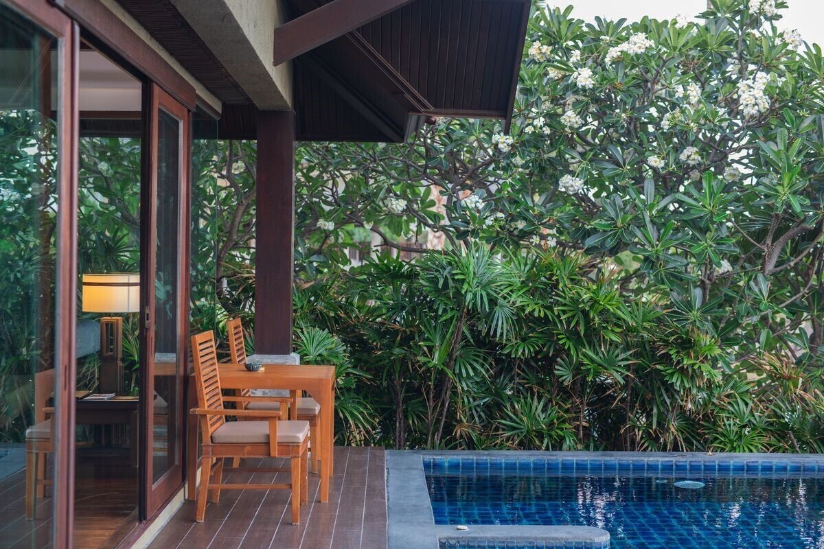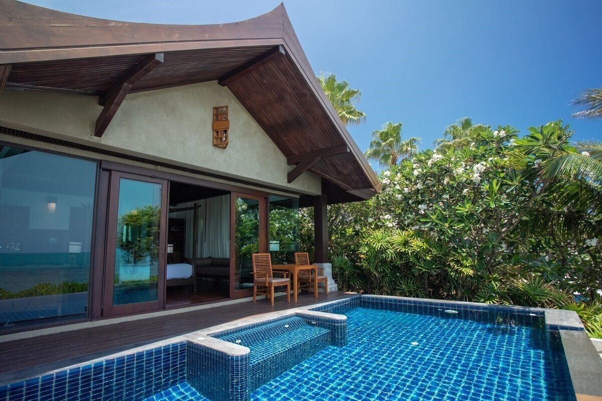 Pool Villa Beach Side    Подробнее Свернуть  - Комментарии16 номеров. Площадь 115 кв.м. Терраса. Вид на море. Собственный бассейн. Покрытие пола - дерево. В номере: двухместная кровать, ТВ (есть 1 российский канал), CD/DVD плеер, телефон (платно), чайные принадлежности. Индивидуальный кондиционер. Электронный сейф (бесплатно). Мини-бар (пустой, заполняется за дополнительную плату). Халат и тапочки. Душ. Джакузи. Фен. Банные принадлежности. Wi-Fi (бесплатно). Дополнительная кровать - софа. Уборка номера - ежедневно. Смена белья - 3 раза в неделю. Номер расположен в вилле.