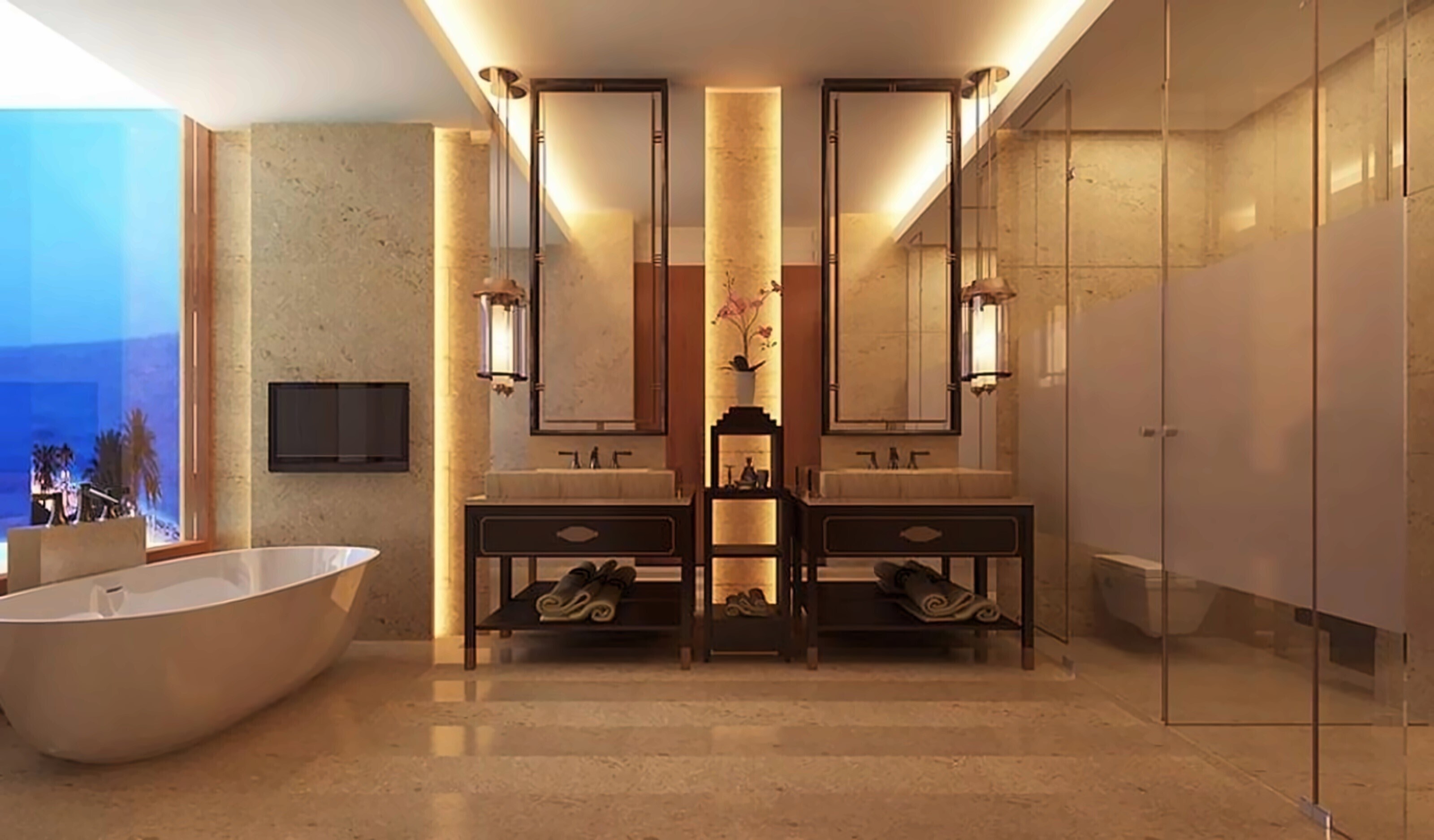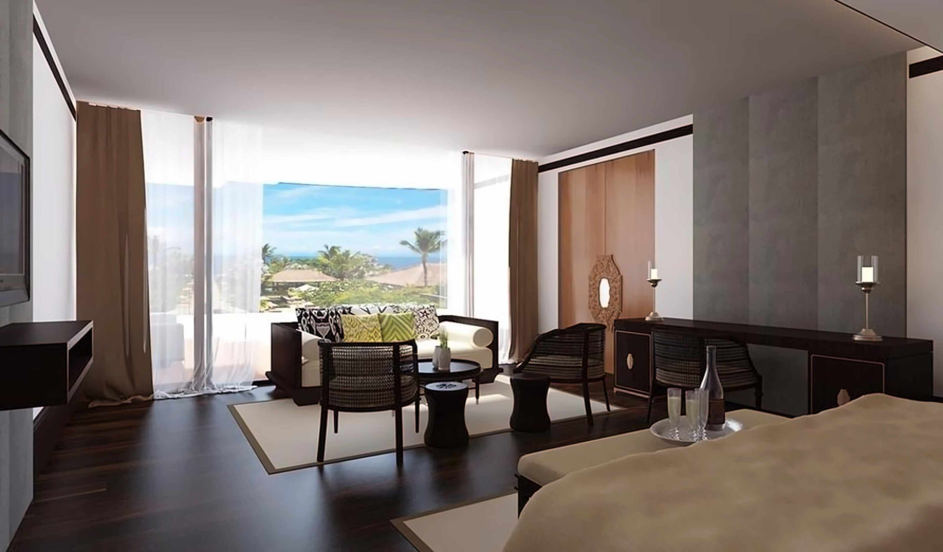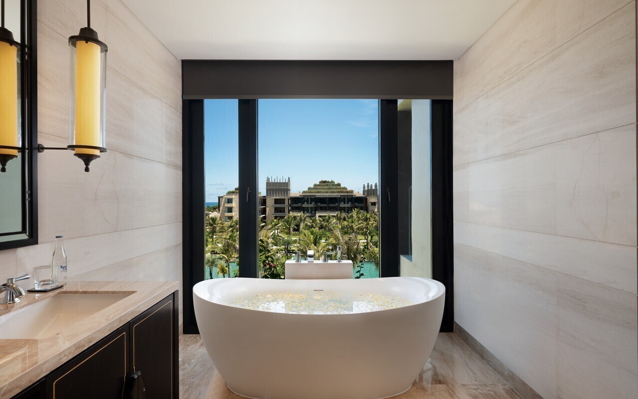 - КоментаріЕлегантно оформлений просторий люкс із панорамним краєвидом на океан та окремою зоною вітальні. Серед зручностей тераса та власний невеликий басейн. У просторій ванній кімнаті встановлені ванна та подвійний туалетний столик.