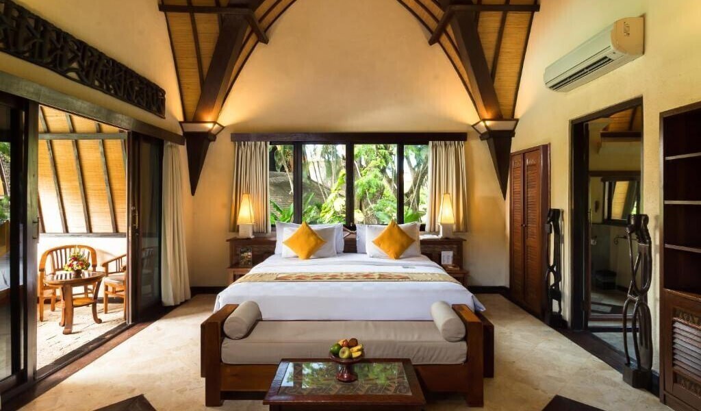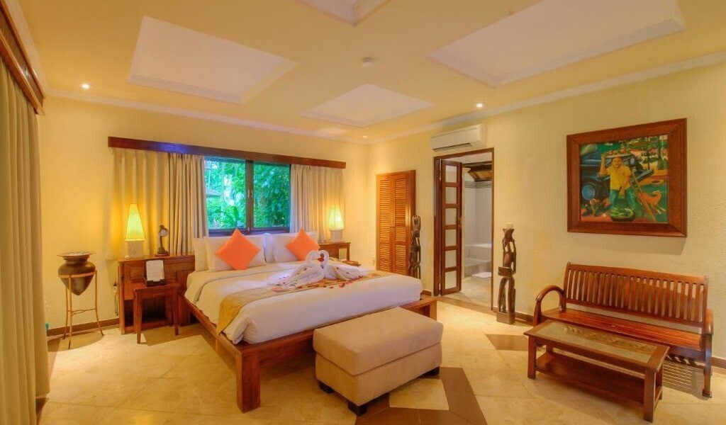 - КоментаріПросторий номер з покритою соломою дахом, хорошим природним освітленням і сучасними зручностями, такими як телевізор з плоским екраном, DVD-плеєр, електричний чайник і персональний сейф. Серед зручностей власний балкон з вітальнею і видом на сад. Власна ванна кімната з ванною і душем укомплектована халатами, феном і туалетно-косметичними засобами.
