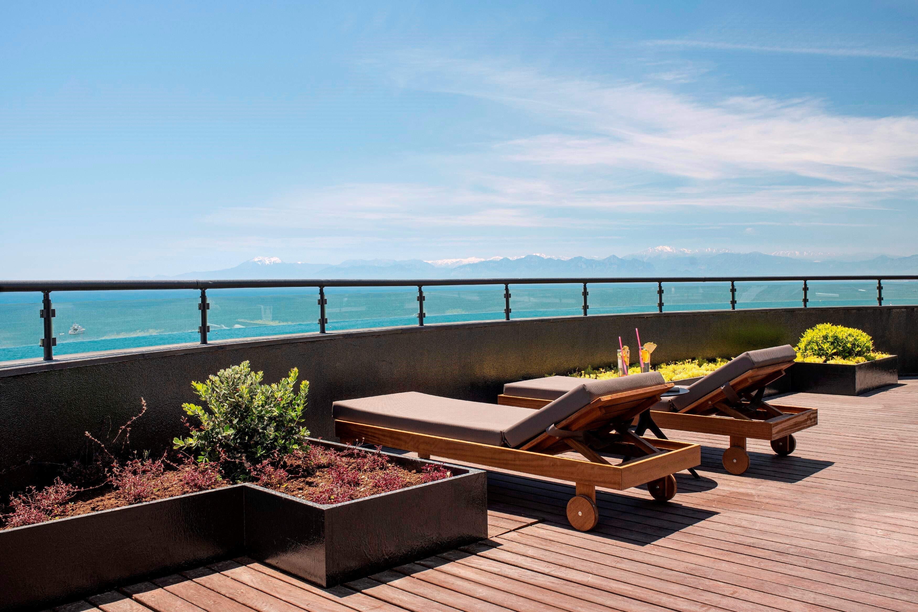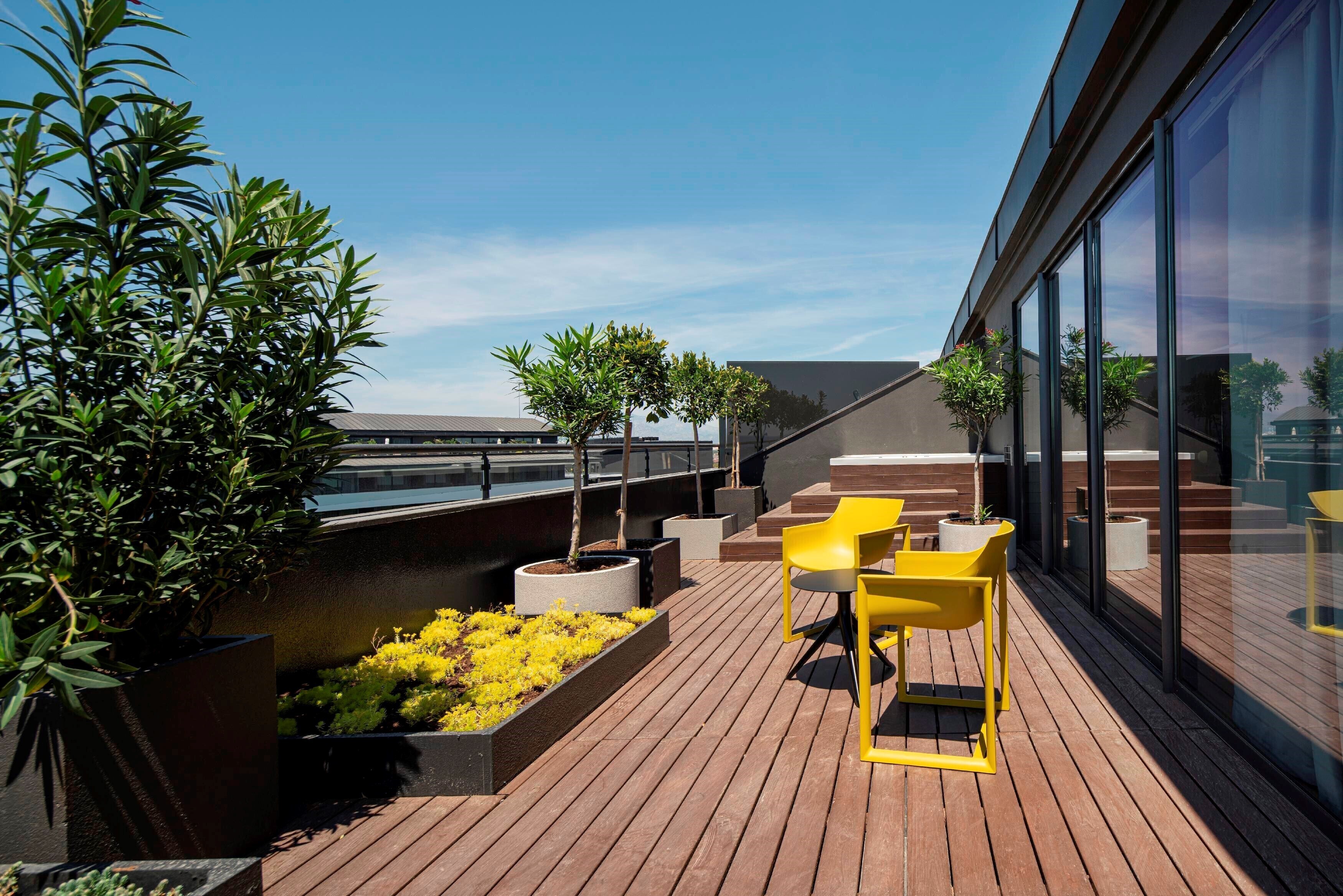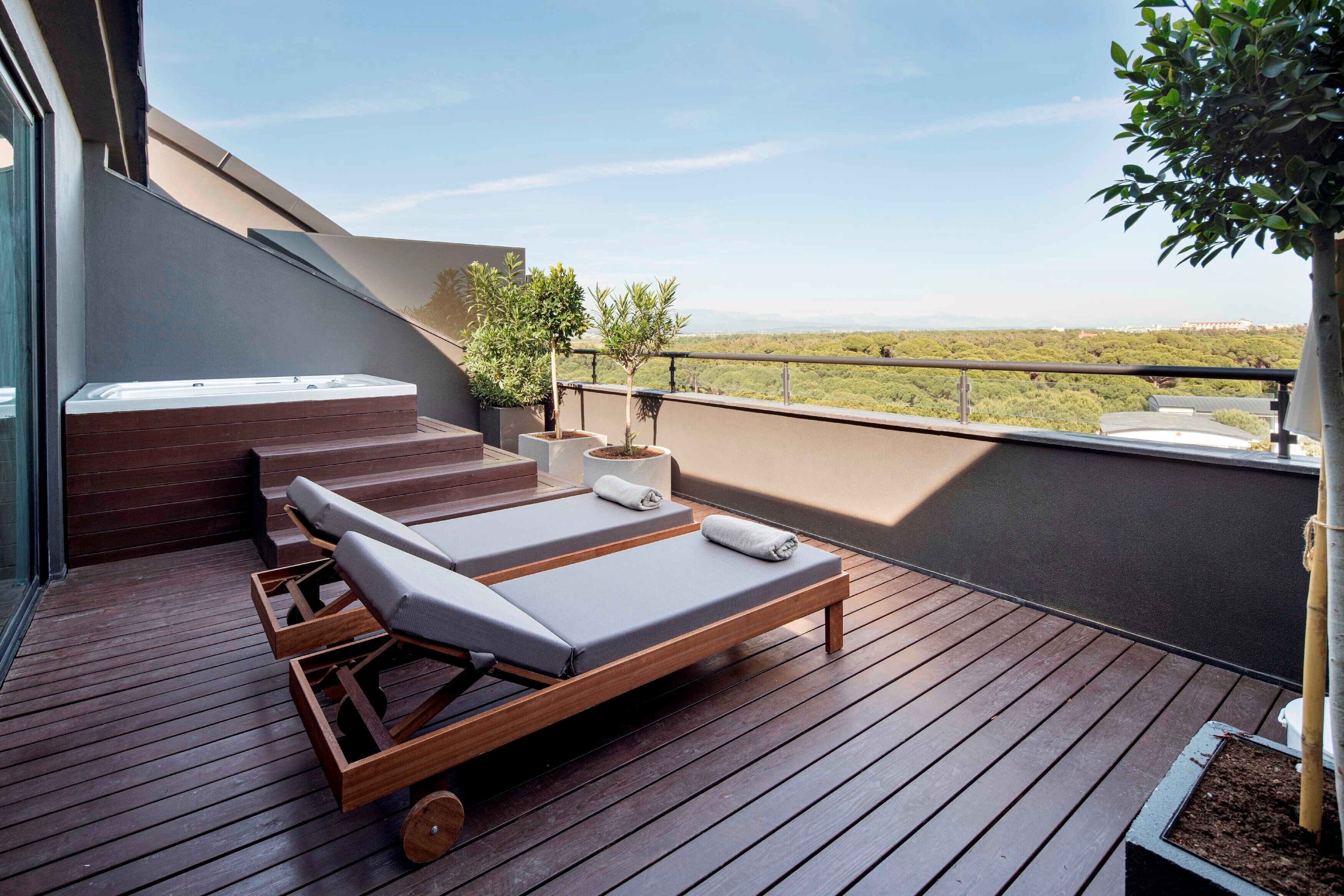 - КоментаріТераса 30 м²: джакузі, 2 шезлонги, 1 пляжна парасолька, стіл та 2 стільці. VIP послуги.
